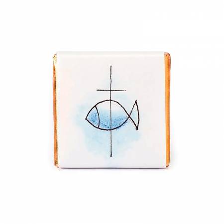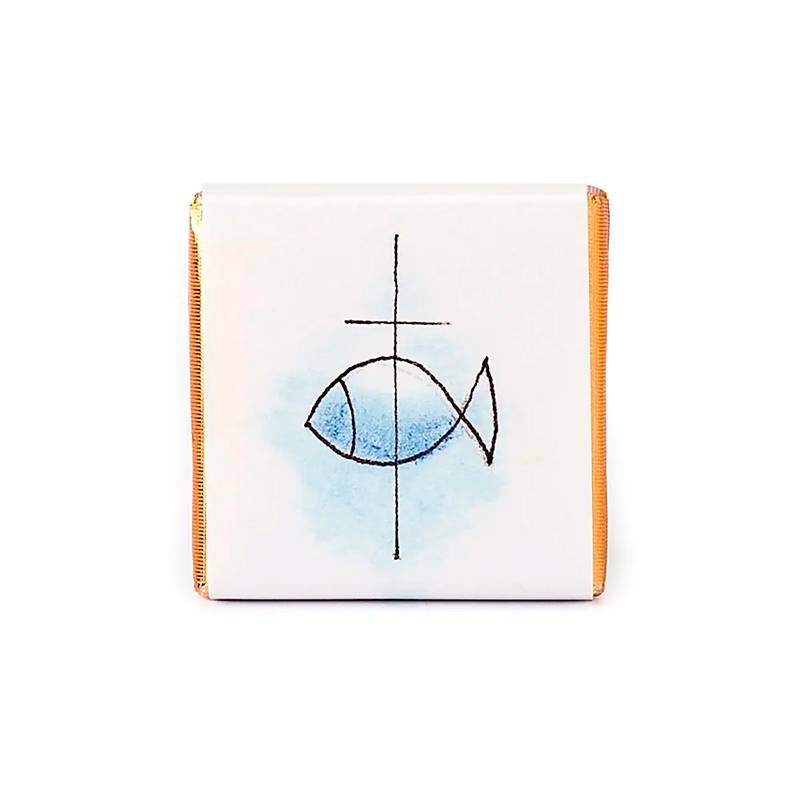 Napolitana de chocolate decorada con un bonito envoltorio con un pez, símbolo adoptado por los cristianos para representar a Jesucristo. Un bonito detalle para dar a los niños durante la celebración de la comunión.