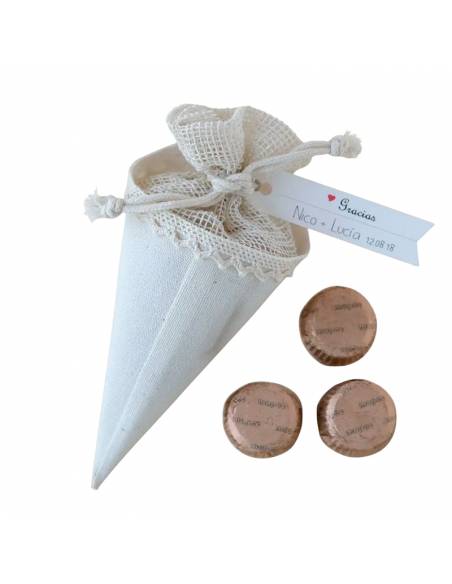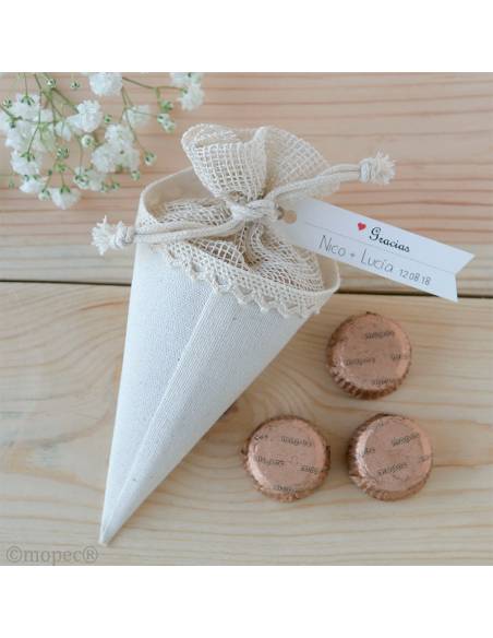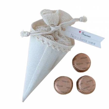 Cono de color marfil con cierre de bolsa para disponer el arroz o los pétalos de rosa de una manera práctica y elegante. Su diseño es perfecto para sostener con una sola mano y su cierre permite transportar fácilmente el contenido. En el interior 3 bombones de chocolate con leche al 32% de cacao recubiertos con papel de color marrón a juego con el cono. El precio no incluye la tarjeta, si desea adquirirla, pinche aquí