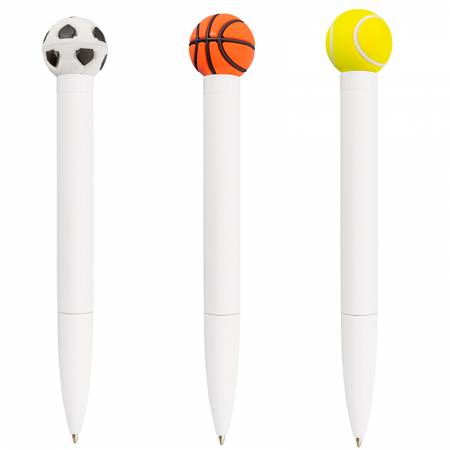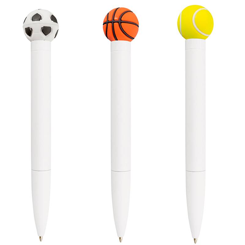 Originales bolígrafos con motivos deportivos. Esta disponible en 3 modelos: fútbol, tenis y baloncesto. Cabezal giratorio y tinta en color azul.