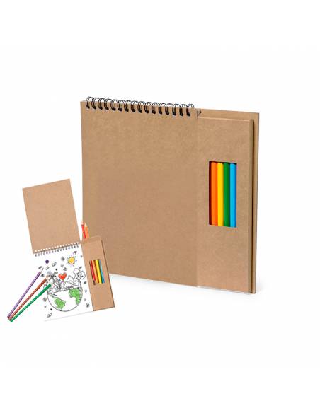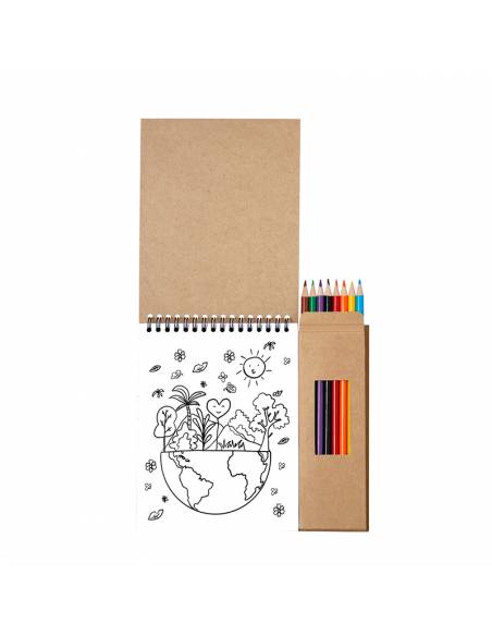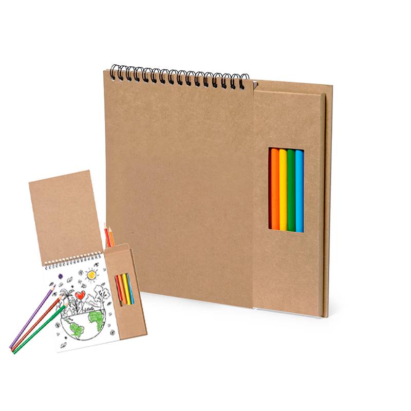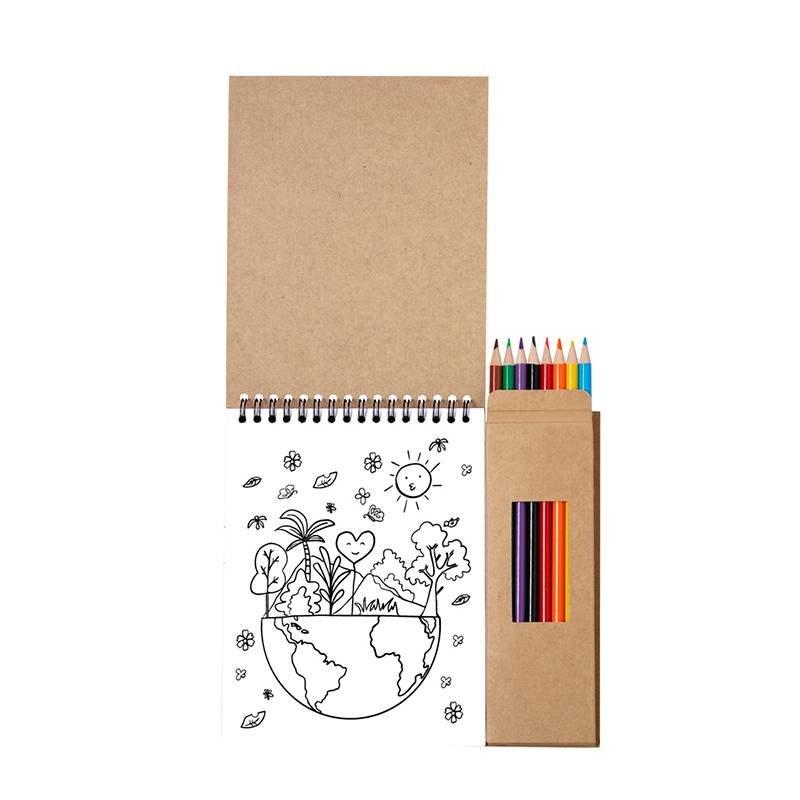 Fantástico set de lápices y bloc hecho en cartón reciclado. Contiene estuche con ventana de 8 lápices con cuerpo hexagonal de variados colores y un bloc de notas de anillas con 6 hojas de motivos naturales y 18 páginas en blanco.