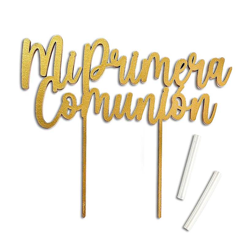 Elegante decoración de madera para tartas con la inscripción de Mi Primera Comunión lacado en dorado. De muy fácil uso ya que sólo tendrá que pinchar en el elemento a decorar además, incluye un tubo protector en la parte final que está en contacto con la tarta. Da a tus fiestas un toque divertido y original con estos cake toppers!. Es apto para contacto alimentario.