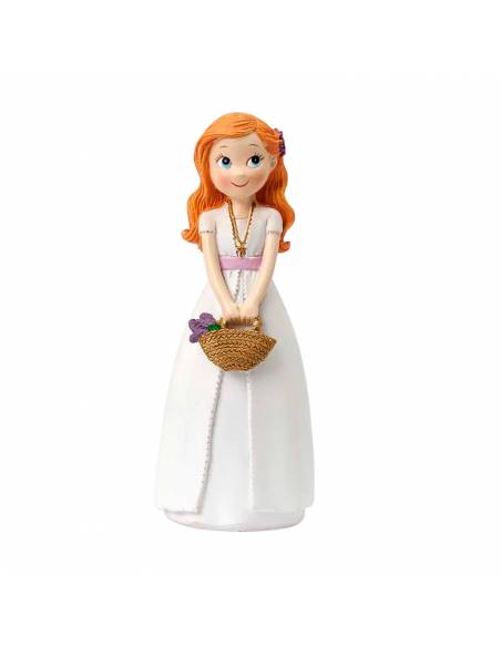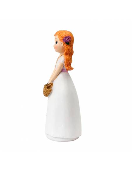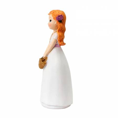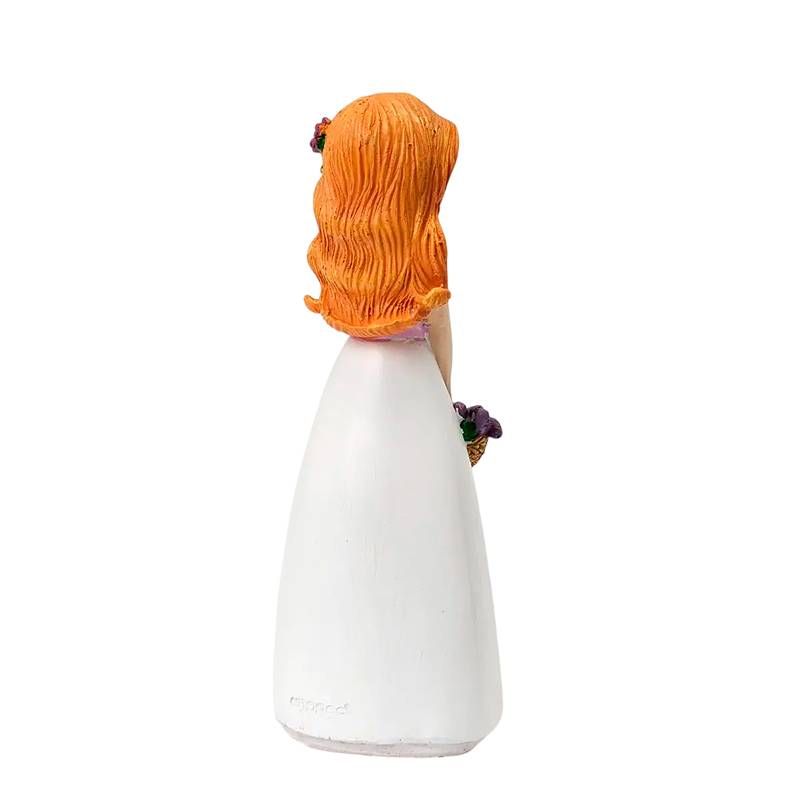 Delicada figura para la tarta de la Primera Comunión. Niña vestida de blanco con un fajín y diadema en amarillo. En la mano una paloma a modo decorativo.