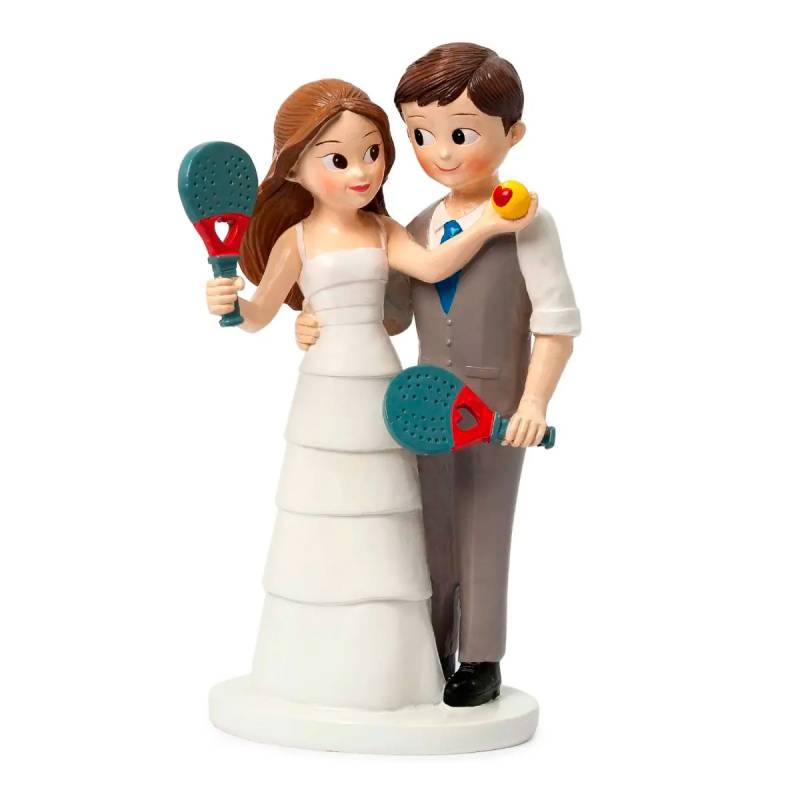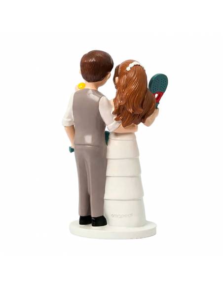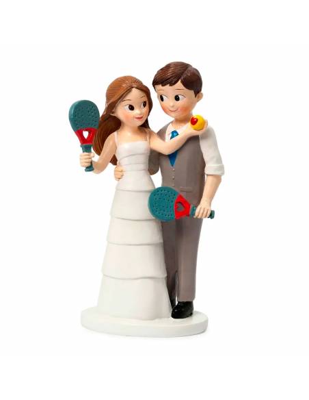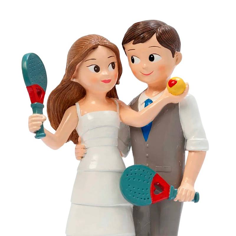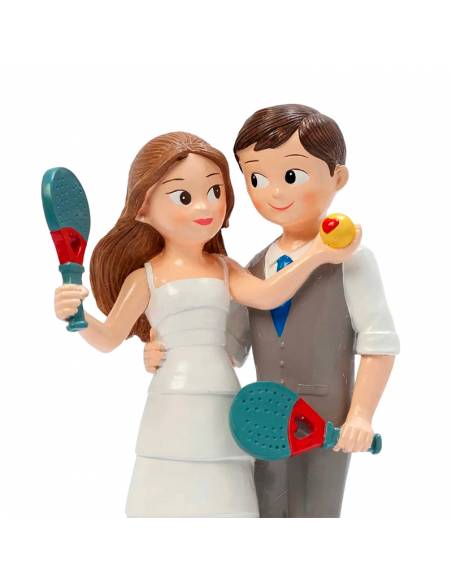 Preciosa figura de boda para decorar la tarta el día del enlace. Diseño moderno y juvenil en el que los novios están listos para ir a jugar al pádel. Es una figura perfecta para parejas deportistas aficionadas al pádel o tenis. Una bonita figura de pastel para decorar la tarta en el restaurante en día del enlace y también para regalar a las parejas que se van a casar en un futuro. Para evitar el contacto directo de la figura decorativa con la tarta se recomienda poner una peana, oblea o capa de fondant y retirarla antes de servir.