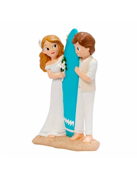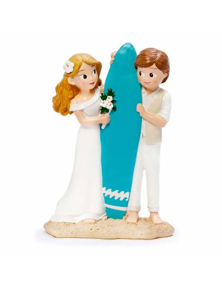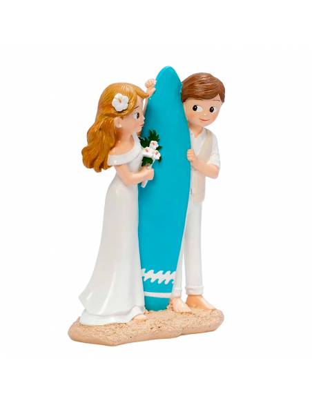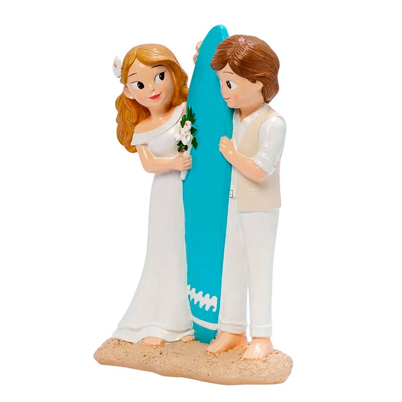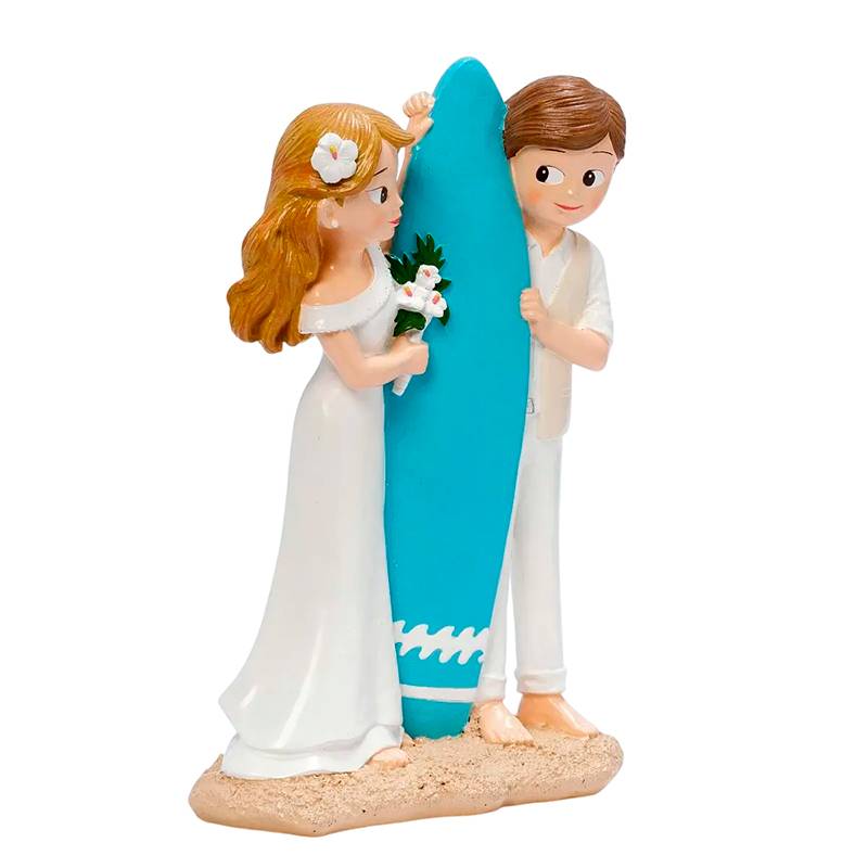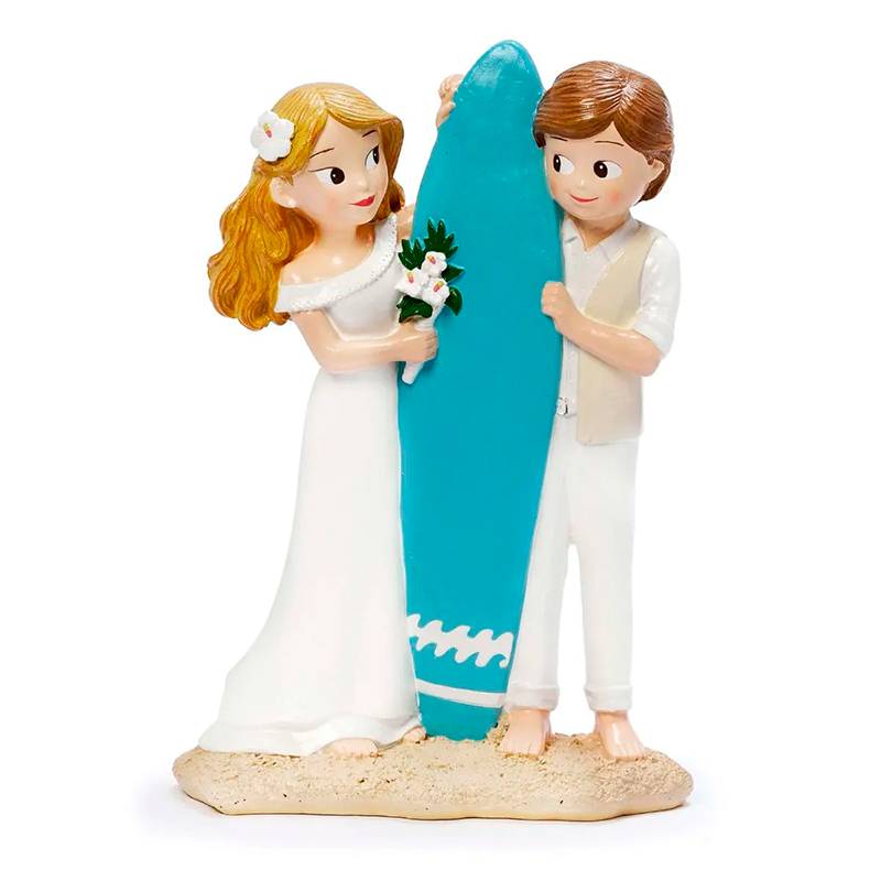 Figura pastel novios surferos, fabricada en resina y de medidas 13,5 x 19 cm.