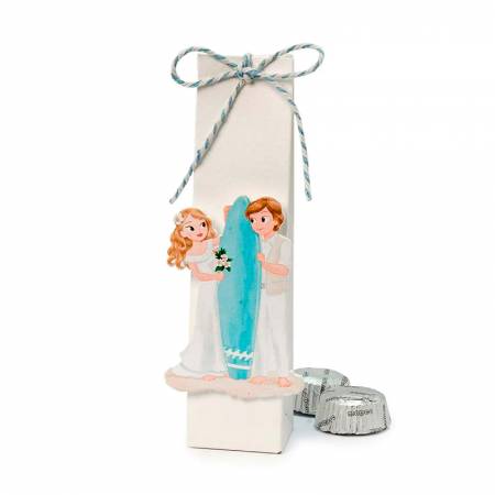 Imán de madera novios surferos. Se presenta en caja blanca decorada con 2 bombones