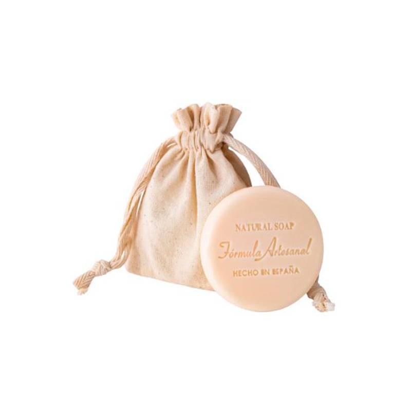 Jabón vegetal de 40 g con presentación en bolsita de algodón. Perfecto como complemento de cuidado personal o pequeño regalo útil.