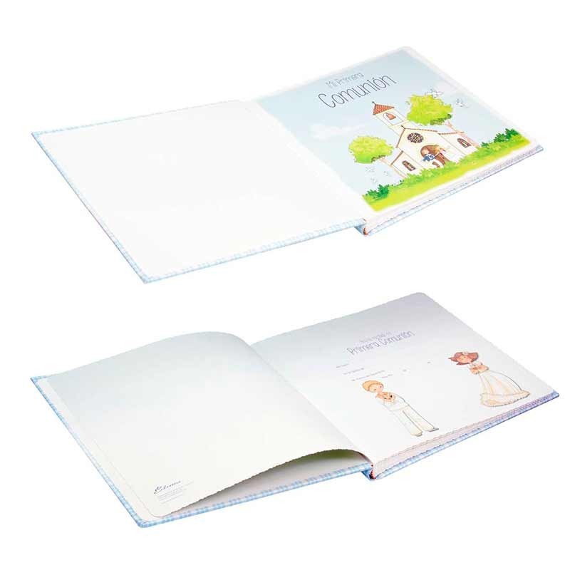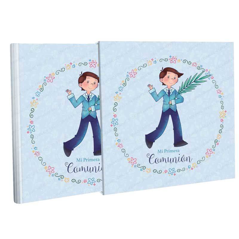 Libro de firmas para Comunión con un práctico estuche para su protección. Decorado con una bonita ilustración de un niño con un elegante traje para su comunión, saludando alegremente y portando una espiga. Un regalo imprescindible para que el niño conserve las firmas, dedicatorias y fotos de sus invitados a su celebración.