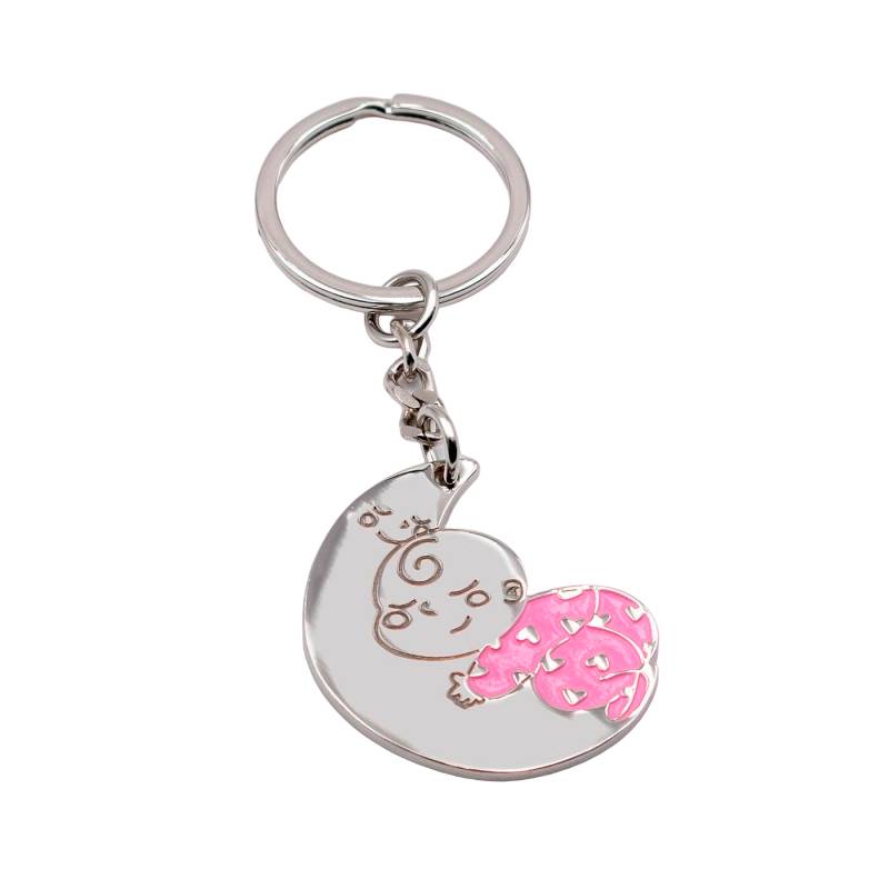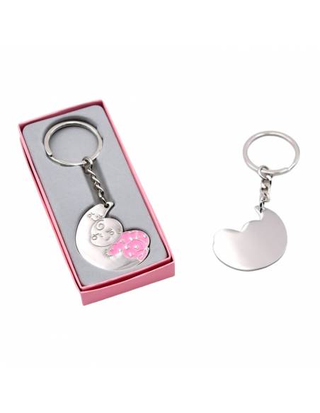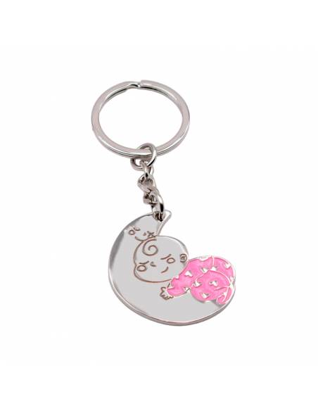 Llavero de metal y esmaltado con la silueta de una tierna bebe con pijama en color rosa, dormida sobre la luna. Se presenta en caja de cartón rosa. Si desea el llavero grabado seleccione la opción en el menú desplegable.
