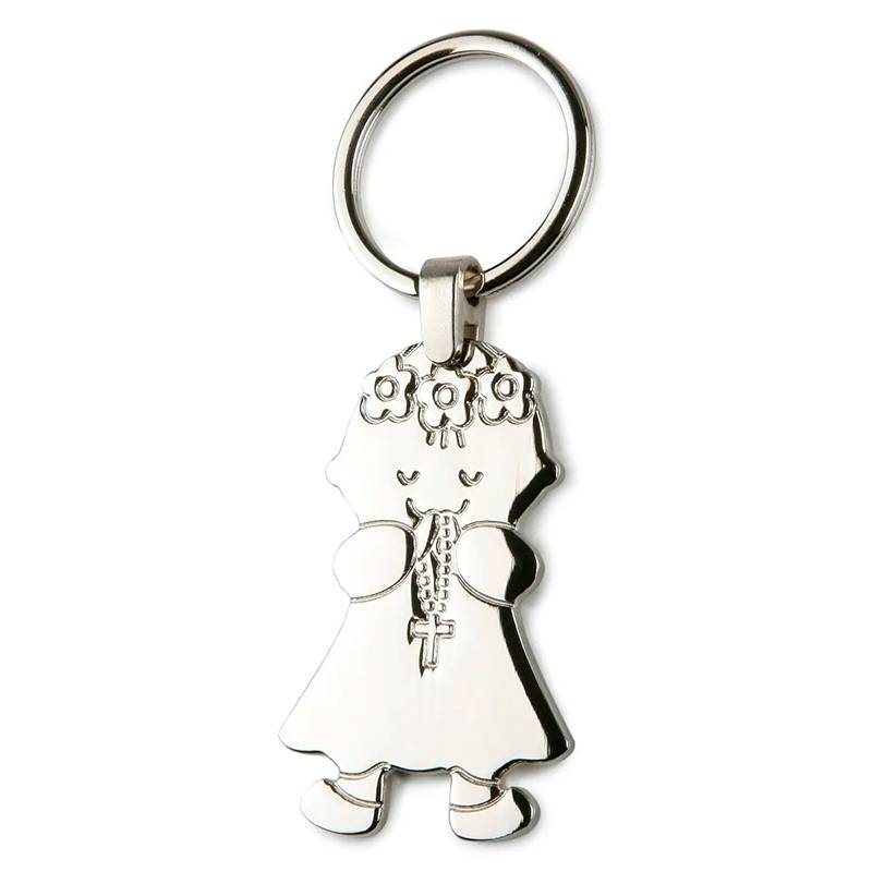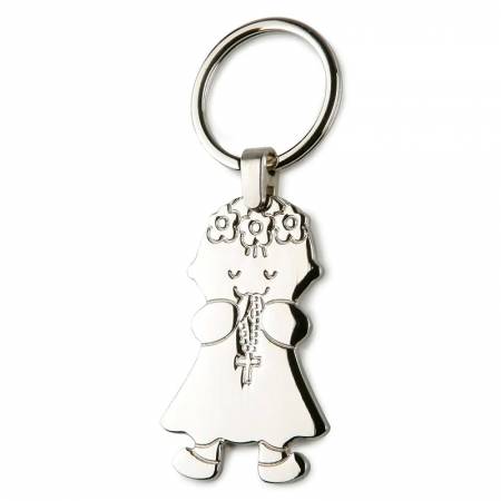 Llavero de metal de la colección Pit y Pita, en esta ocasión representa a una niña con un rosario entre sus manos. Se presenta en bolsa adhesiva con cartulina. Ideal para regalar como recuerdo de la Primera Comunión.