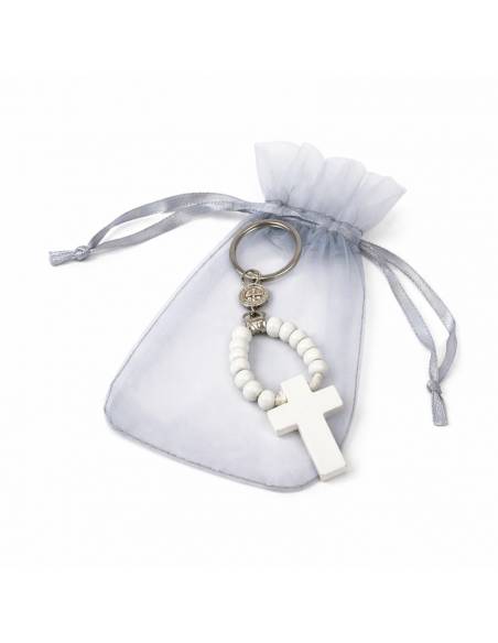 Llavero rosario blanco de madera 11 cm con bolsa gris-plata