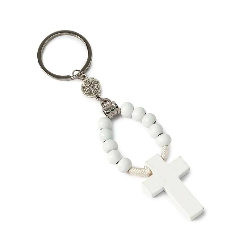 Llavero rosario de madera blanca con cruz, 11 cm de largo. El precio incluye bolsa de organza gris-plata, listo para regalar en celebraciones.
