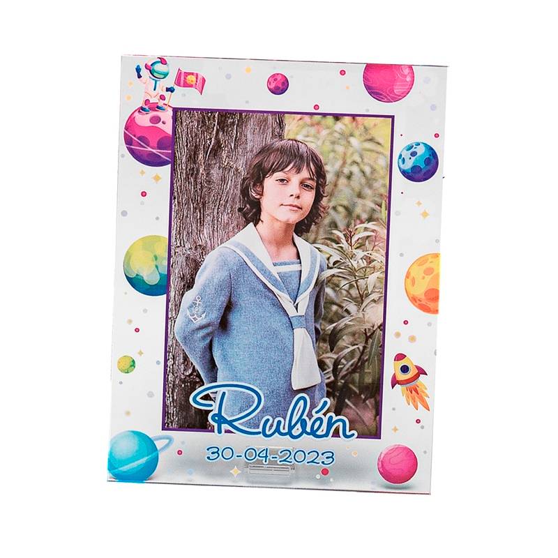 Portafotos fabricado en metacrilato transparente y decorado con dibujos de temática espacial, planetas, astronauta, cohete... El portafotos se personaliza con fotografía, nombre y fecha de la celebración.