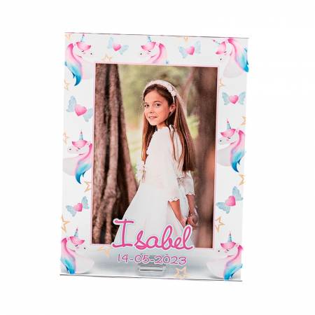 Portafotos fabricado en metacrilato transparente y decorado con dibujos de unicornios. El portafotos se personaliza con fotografía, nombre y fecha de la celebración.