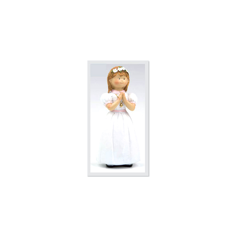 Adorable figura para la tarta de la Primera Comunión. Niña con un bonito vestido blanco con fajín amarillo y un ramo de margaritas en las manos. Adorna su pelo con un lacito en color amarillo.