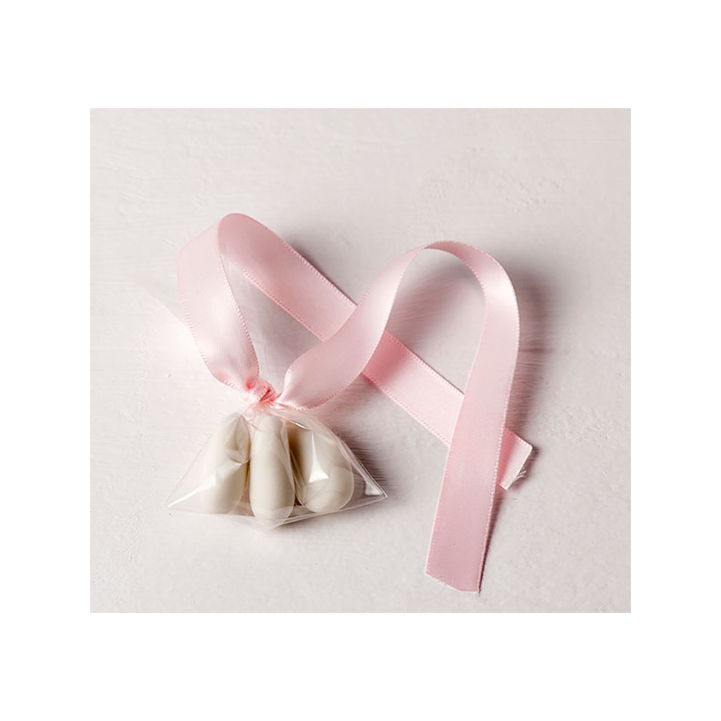 Adorno o pic con tres peladillas blancas almendra, en celofán y lazo saten en rosa.