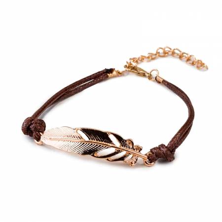 Pulsera cordón marrón pluma metal dorada