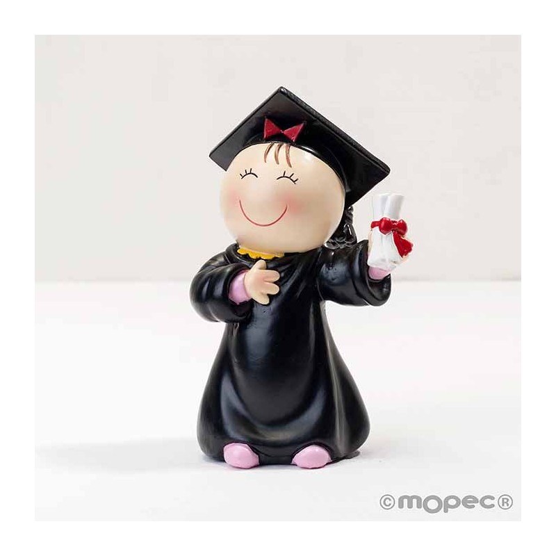 Simpática figura de pastel para celebrar la graduación de una chica. Es una figura de una chica vestida con toga y birrete enseñando orgullosa su diploma. Es la figura de pastel perfecta para agasajar a la graduada y que todo el mundo admire su pastel.