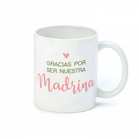 Taza de cerámica "Gracias Madrina" en caja de cartón. Al ser un detalle que se puede usar en el día a día, la madrina recordará con una sonrisa el precioso día de la celebración. Perfecta para beber bebidas calientes y frías y es apta para poner en el lavavajillas.