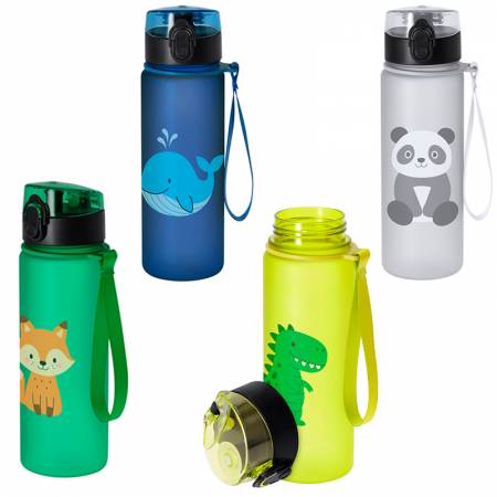 Botella de agua infantil de 500 ml en Tritán, con apertura mediante botón, cierre seguro y asa para transportar. Disponible en 4 diseños. Se vende por unidad, con opción de elegir modelo o comprar surtido.